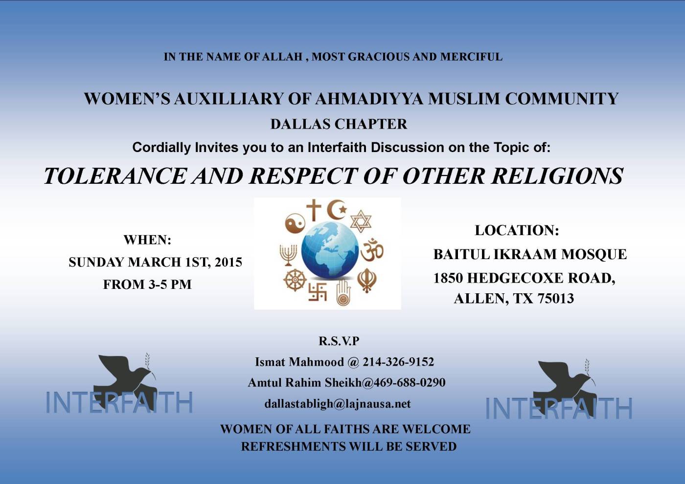 The Ahmadiyya Muslim Community’s Women’s Auxiliary is hosting an Interfaith Symposium on Sunday, March 1st from 3-5 p.m on the topic “Tolerance and Respect of Other Religions.” Speakers from the Christian, Hindu, Jewish and Muslim faiths will be participating. This event is for women only.